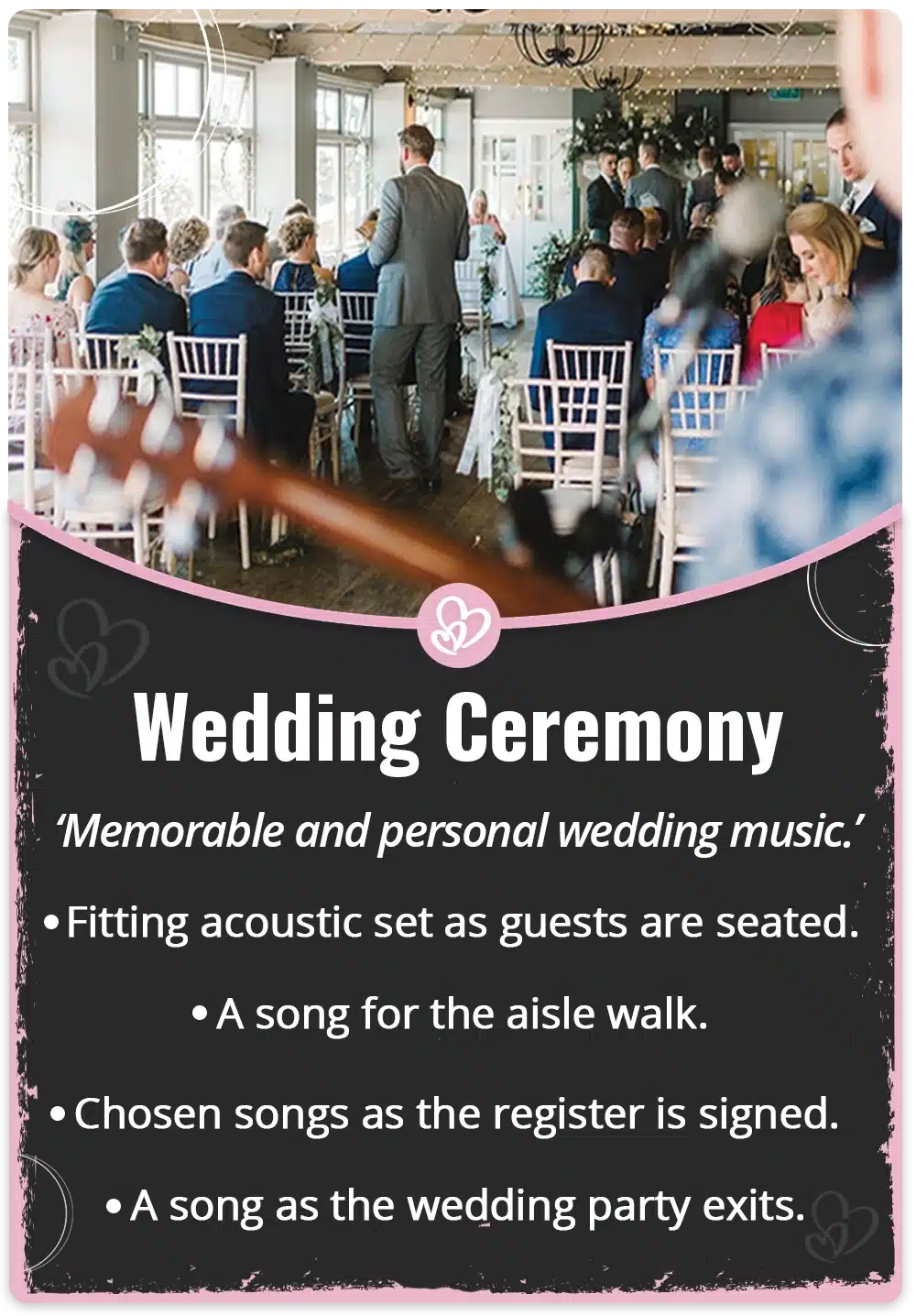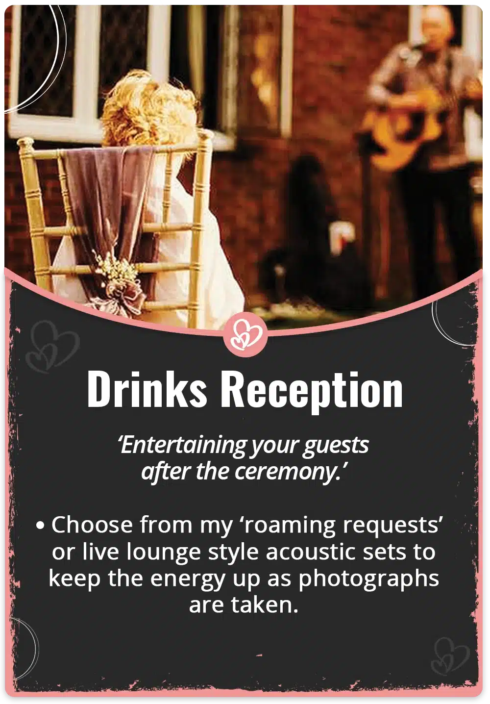 From the music as guests are seated for the wedding ceremony, to the last song of the night – My ‘All Day Wedding Music Package’ has it covered. Please visit my ‘Custom Wedding Music’ page to find out more. There’s more information to show you some of the possibilities available on your big day.